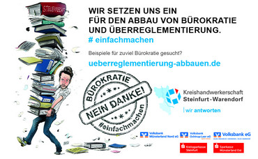 Nach der Kampagne gegen Bürokratie und Überreglementierung im NRW-Landtagswahljahr 2017 legen Kreishandwerkerschaft Steinfurt-Warendorf und heimische Kreditinstitute jetzt noch einmal nach.